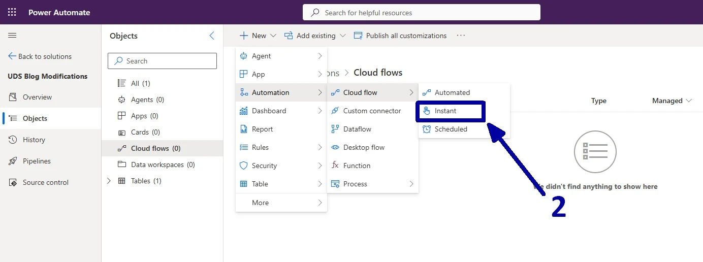 In the environment where you plan to work, start by creating a new instant cloud flow (2).