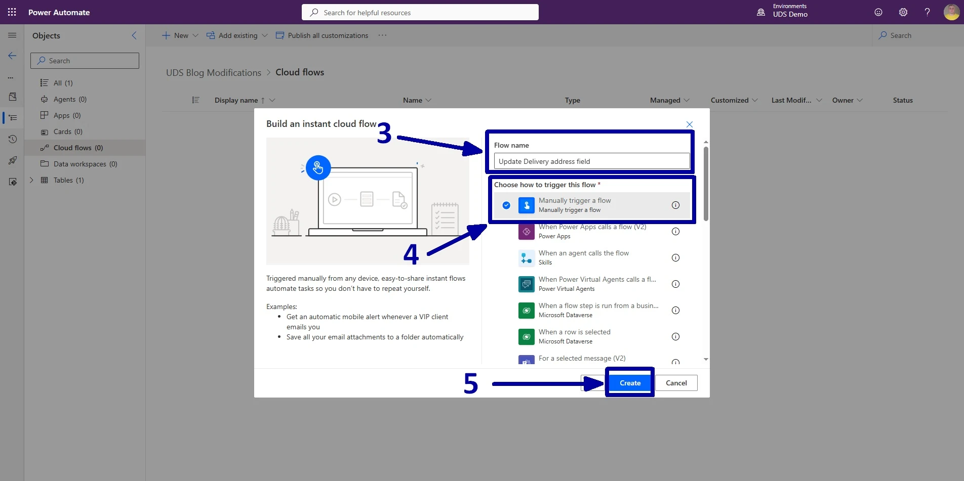 Give the flow a clear name (3), set the trigger to “Manual” (4), and then click on the “Create button” (5) to proceed.