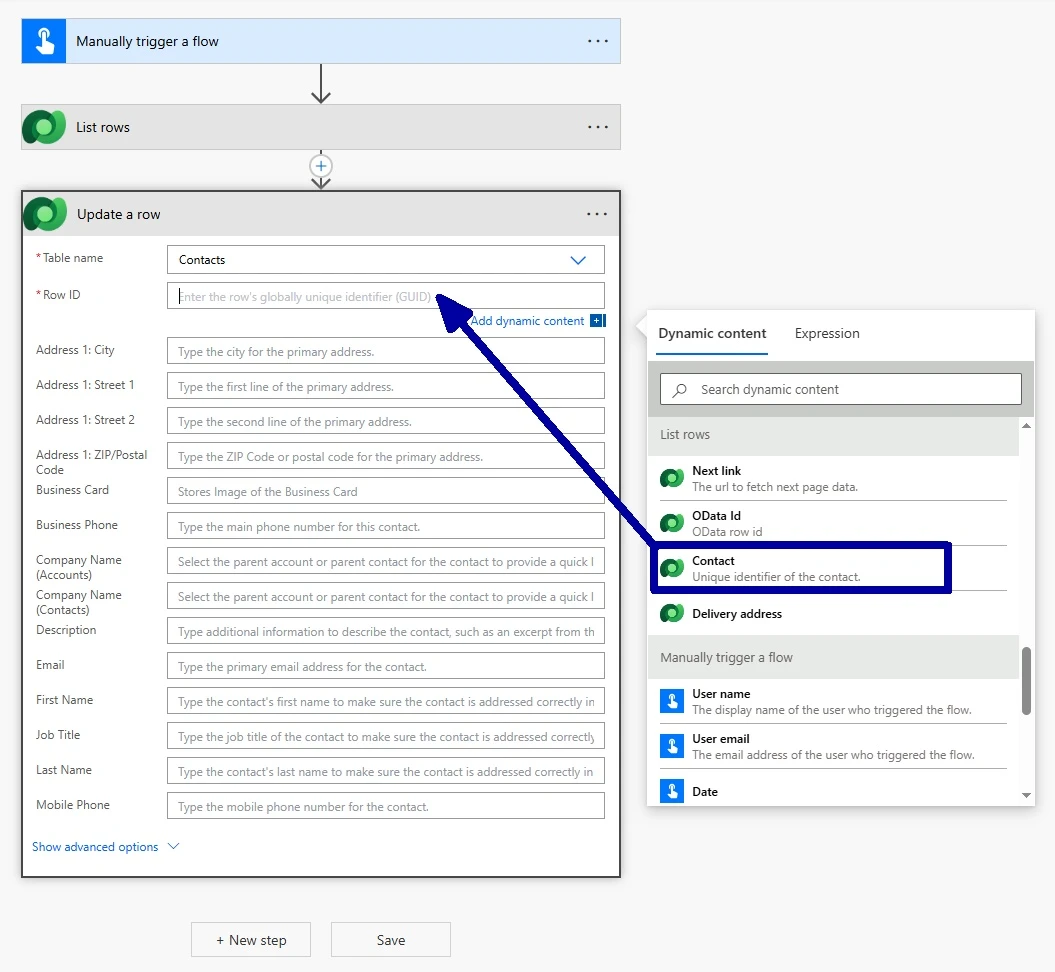 Now, open the "Apply to each" and "Update a row" sections. Then, scroll down to the "Delivery address" field, click on the dropdown, and choose “Existing”.
