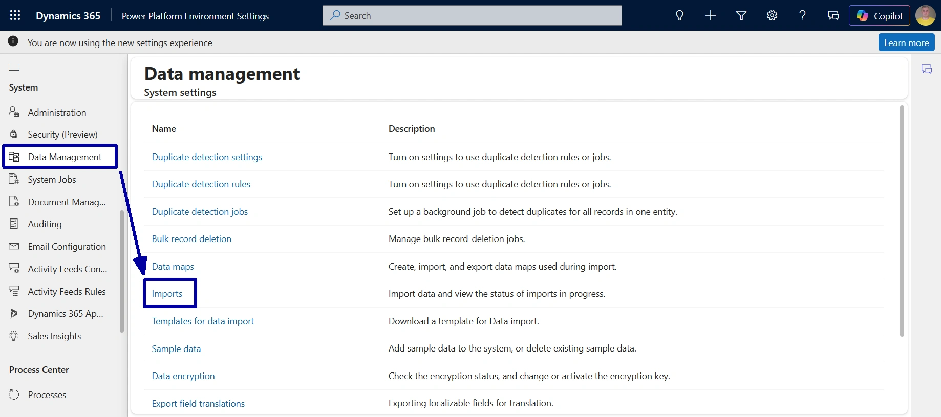 Now, select the “Data Management” item on the left and choose the “Imports” option.