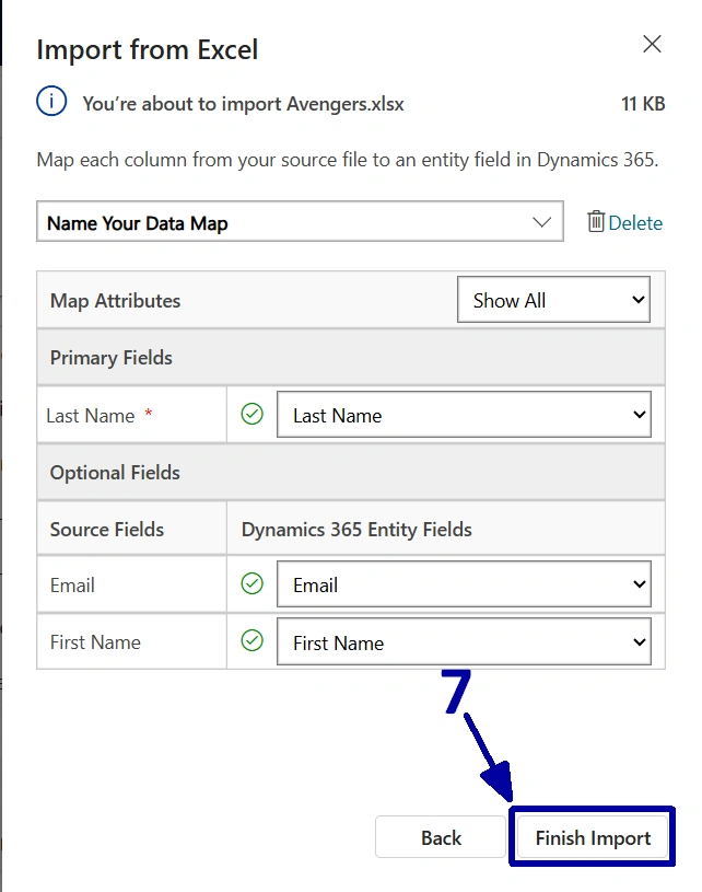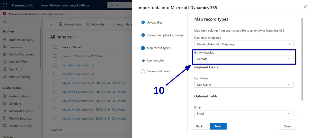 ! Note. The main difference is that, since you are importing the file outside a specific table, the system does not know which table to assign the new records to. Because of that, at the “Map record type” step, you need to select the appropriate “Entity Mapping” option (10).