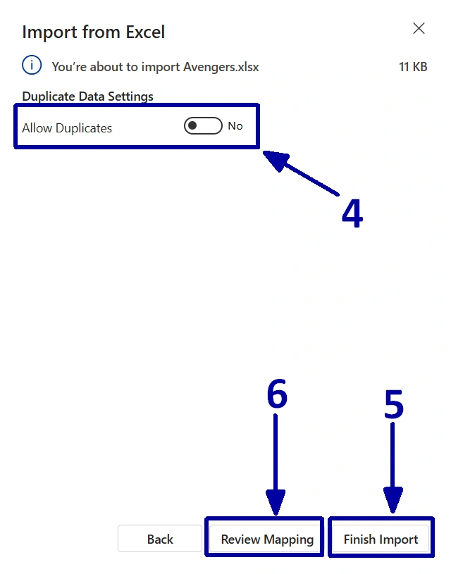 On the next sidebar page, you can choose whether to allow or prevent duplicate creation (4). Once you get more comfortable with the import process, you can even click on the “Finish Import” (6) right away to start it. But for now, if you are still learning, it is better to select the “Review Mapping” (5).
