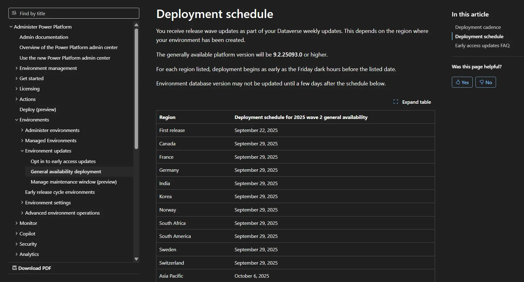 If you heavily use Power Platform, this page shows the specific deployment schedules broken down by geographic region. Link: Power Platform Deployment Schedule