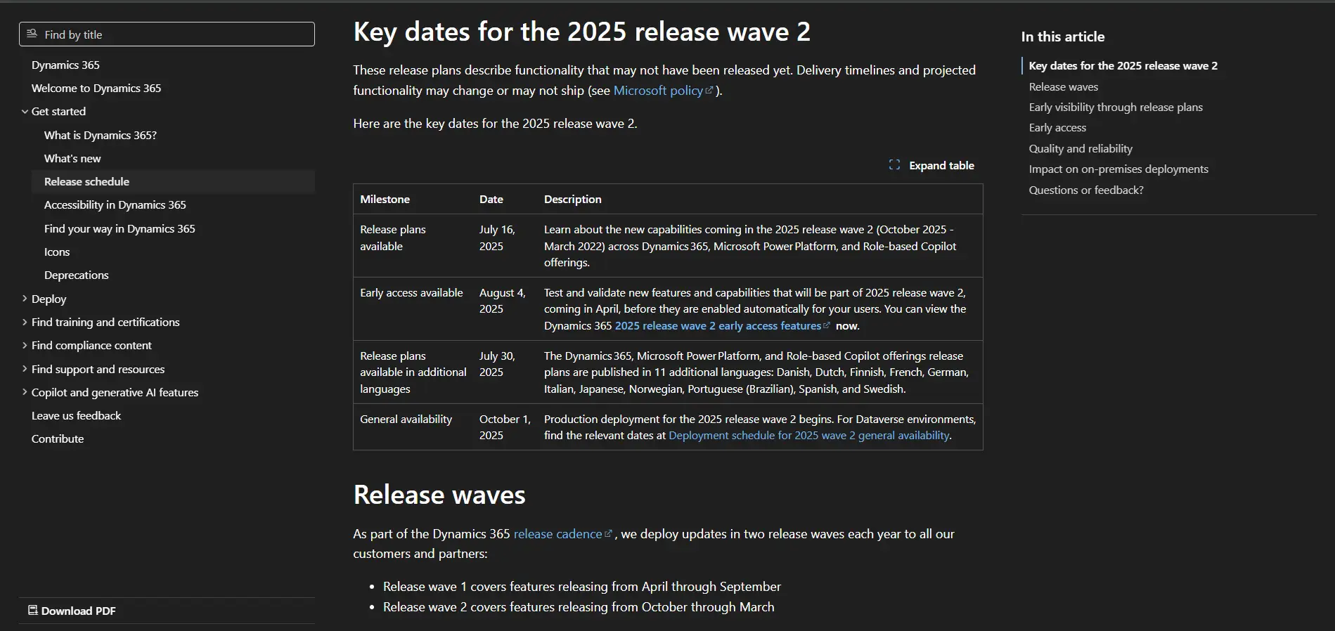 This is the most critical page for your planning. It provides the exact dates for Early Access (when you can start manual testing) and General Availability (the automatic deployment deadline). Link: Dynamics 365 Release Waves Schedule