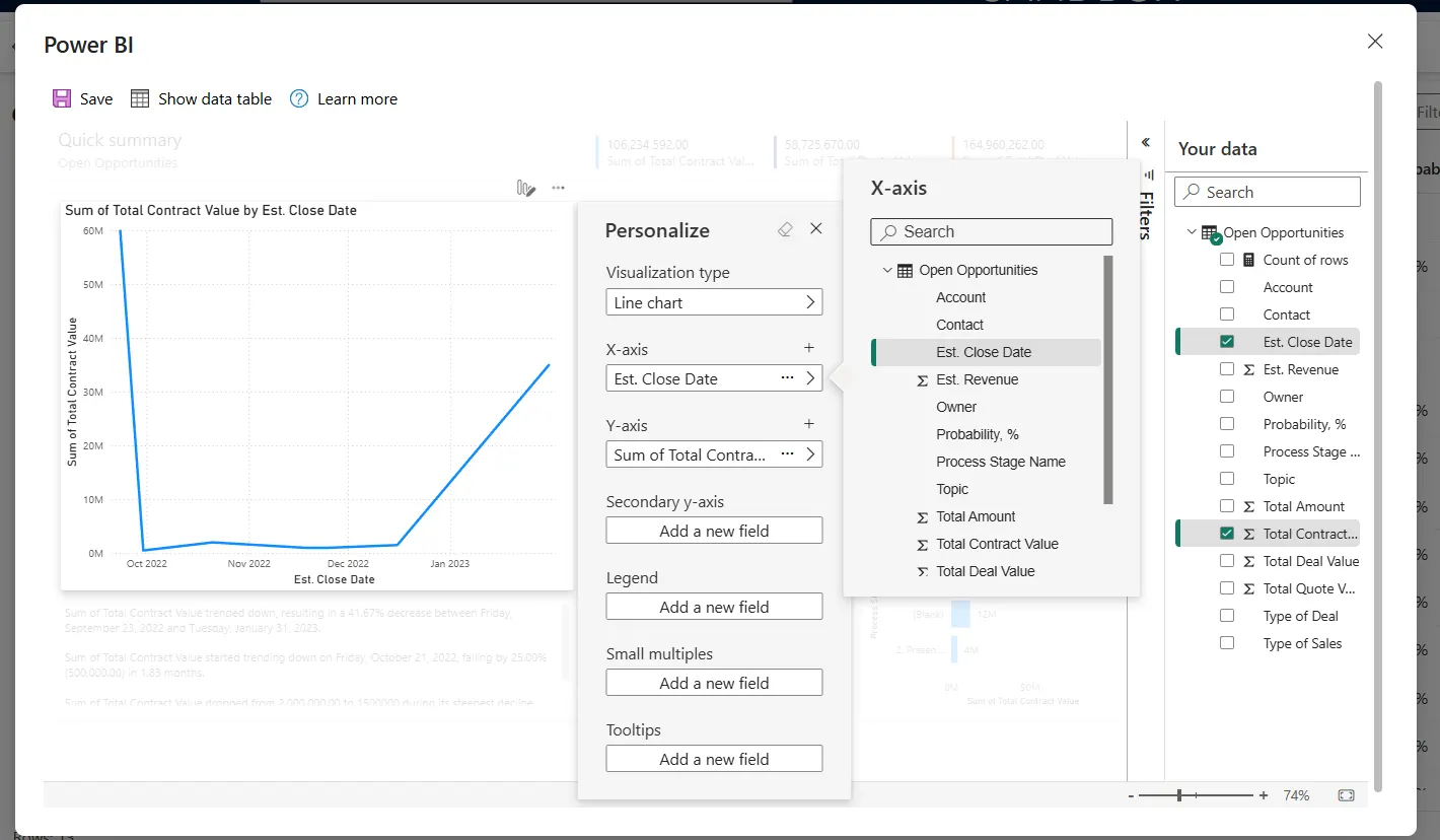 Swap fields: drag and drop fields from your view onto the axes. For example, changing the axis from “Owner” to “Estimated Close Date.”