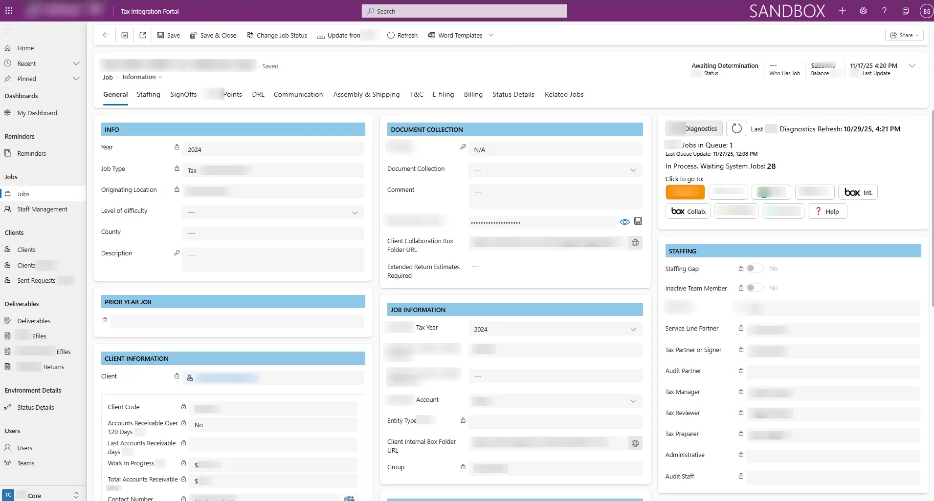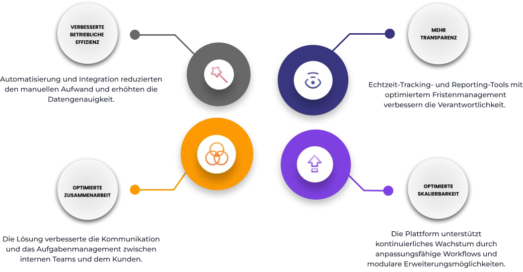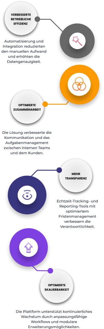 Das Projekt lieferte eine zentrale, durchgängige Plattform zur Optimierung der Projektabläufe des Kunden, basierend auf dem Konzept „Aufträge“. Eine einheitliche Kundendatenbank wurde implementiert, die eine nahtlose Kundeninteraktion durch individuell angepasste Aufgabenlisten, Dateneingabeformulare, Genehmigungen und Dokumenteneinreichungen ermöglicht.