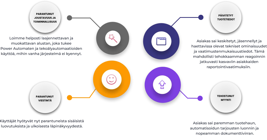 Kaikki tarvittavat integraatiot työkaluihin, kuten Teams, Outlook ja SharePoint, sekä kolmannen osapuolen alustoihin prosessien automatisoimiseksi, tiimiyhteistyön parantamiseksi ja rutiinitehtävien tehostamiseksi.